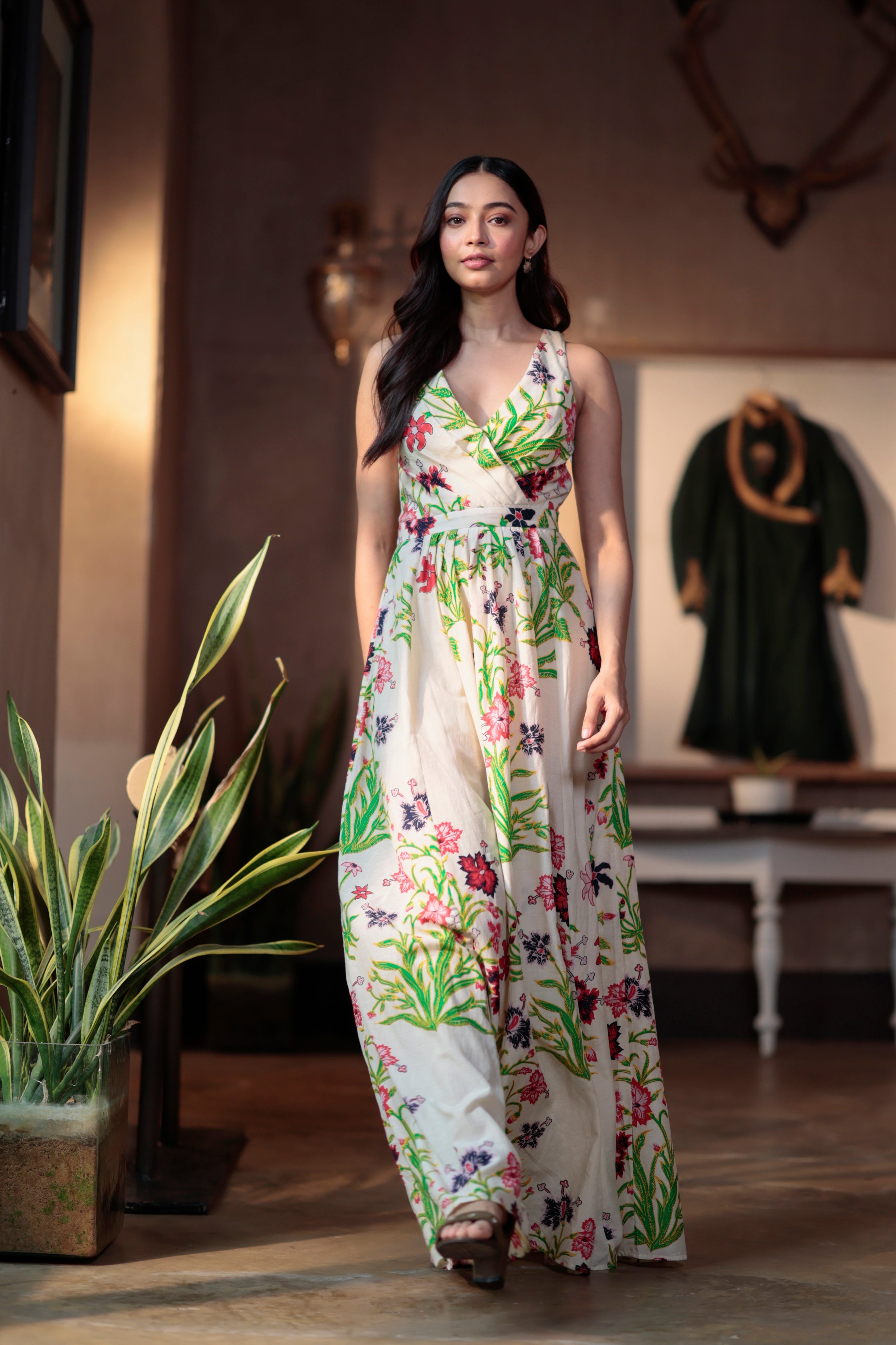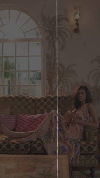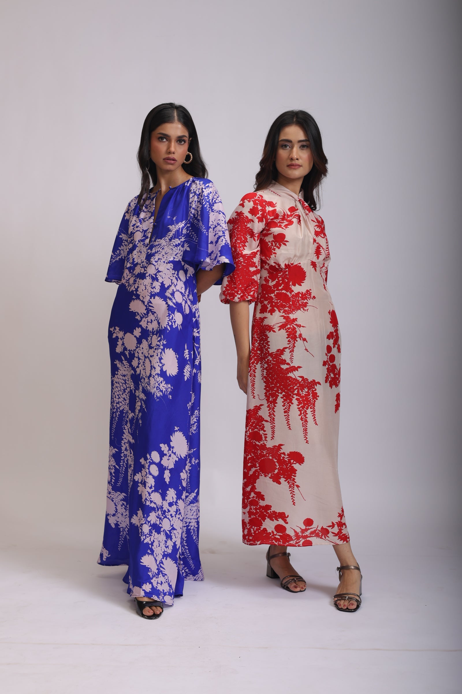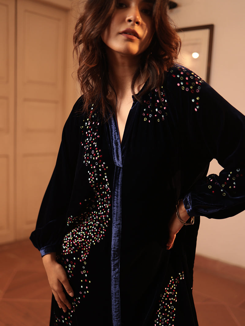 VEENA LONG DRESS IN SILK VELVET HAND EMBROIDERERD NECKLINE
